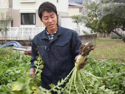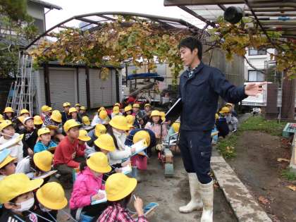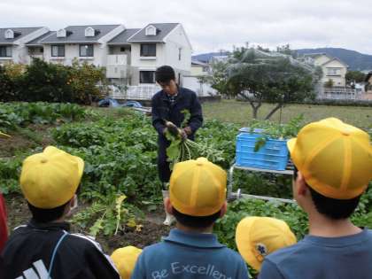 3年生は今日,社会科の学習で地域にある畑の見学に出かけました。畑では,冬野菜の大根や白菜が見事につやつやと大きく育っていました。子どもたちの肩のあたりまでにも育った野菜の畝を歩いて丹念に育てておられる清水さんにお話を聞きました。育て方やそのご苦労,育てるまでのお気持ちなどたくさんの話を聞かせていただきました。