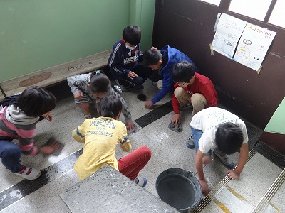 給食室から続く廊下と階段をピカピカにしました☆