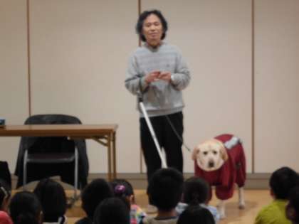 今日は,視覚障害のある方に2年生と4年生と6年生がお話を聞きました。盲導犬のアーサーくんは,「お仕事中」のプレートを背中に付けて,ご主人の進む道をリードして歩きます。目が見えないとどんな困ったことがあるのか,歩道を歩くときに気を付けていることはなにかなどお話を熱心に聞きました。