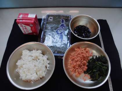 今日の給食は,麦ごはん・梅鮭おにぎりの具・ほうれん草のおかか煮・黒豆・手巻きのり・牛乳でした。