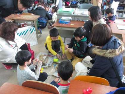 「あそんで ためして くふうして」のグループおもちゃ作りです。