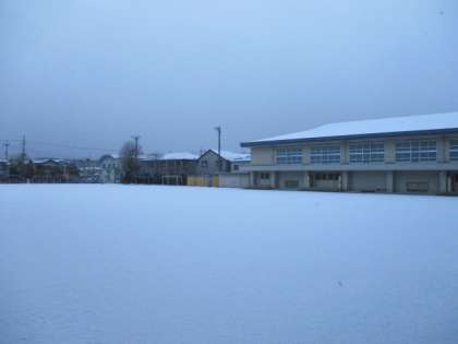 天気予報通り,朝から雪が降っています。運動場も真っ白です。