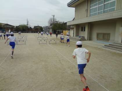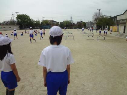 6年生最初の体育はハードル走です。まずは準備の方法,グループ活動のやりかた,跳び方を確認しました。次からは自分たちでアドバイスしながら,上手く速くなれるように学習します。