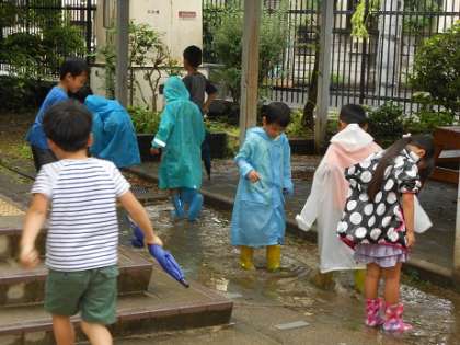 生活科での、雨の日や雨上がりの様子を楽しむ「あめのひ わくわく」の様子です。雨が降ったら、長靴とレインコートを持つてきてもらうようにお願いしていましたが、なかなか雨か降りませんでしたね。子どもたちも「今日、長靴はかへんの?」と心待ちにしていました。今日も出発するころから雨があがってしまいましたが、雨上がりの学校を歩きました。中庭のクモの巣にかかった水滴を観察したり、水たまりに入って「ここ、深い。」「おもしろい。」と言っては楽しんでいました。長靴・レインコート・着替え等のご用意ありがとうございました。