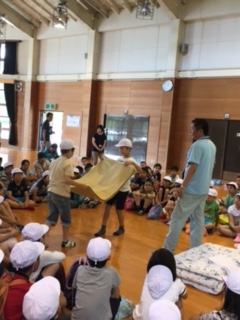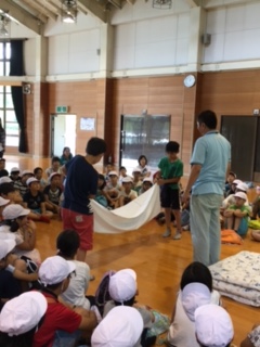 オリエンテーションです。プレイホールで,毛布やシーツの敷き方やたたみ方を所員の方に教えていただいています。自分たちだけでうまくできるかな。