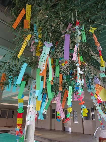 今,学校の体育館前(ピロティー)では,子ども達の願いの書かれた短冊や子ども達が作った飾りでにぎやかになった笹が,風に揺れています。
