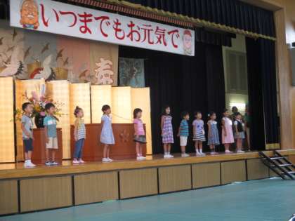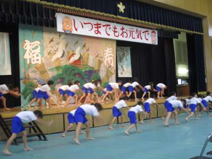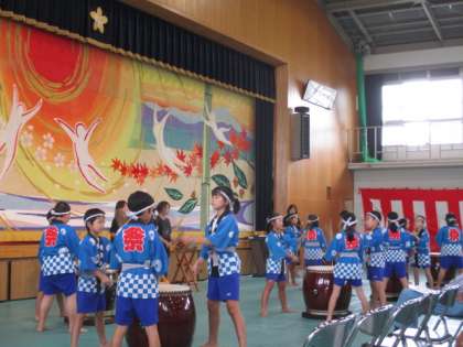 小学校からは,和太鼓部の演奏,1年生のお祝いメッセージ,4年生のソーラン節の演技を披露し,日頃の感謝の気持ちを伝えました。
