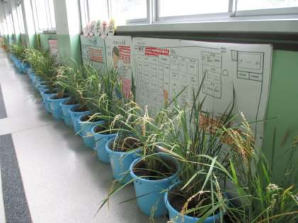 穫り入れを前に,この3連休,台風を心配して,中庭の稲を職員室前廊下に避難させました。