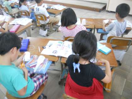 たこ糸を結んだり、カップを切ったりしておもちゃの仕組みを作っています。指先を使う作業が難しく、みんな真剣です。