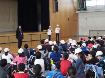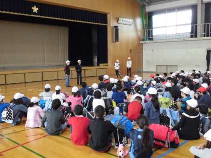 出発式が体育館で行われました。校長先生からは,「感謝」「成長」という言葉をいただきました。お家の方々,山の家の所員さん,友だちなどお世話になる方々に「感謝」して,帰ってきたときには「成長」した姿を見せてくれることを期待しています。