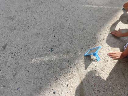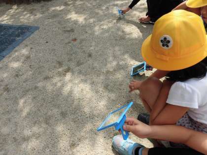 鏡を使って,校舎に光を反射させました。白く光り「きれい」と声をあげていました。