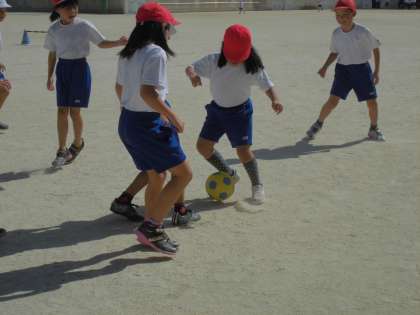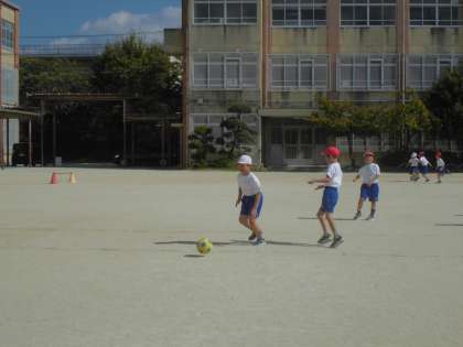 今日のめあては「ルールやゲームの進め方に慣れよう」でした。まずは同じ班の友だちとボールを足でパスしながらゴールへ運ぶ練習です。次にゲームをしました。少しずつルールも分かり進め方も慣れてきて,上手くゲームを進めることができるようになってきています。