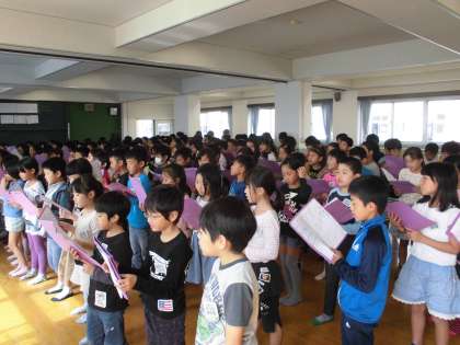 四年生は「THE 祭 2016」というテーマで群読をします。みんなが一斉に声を出す場面,グループごとに掛け合いをする場面など,色々なパターンがあり,それぞれのグループの声が上手く重なり合うように練習しています。