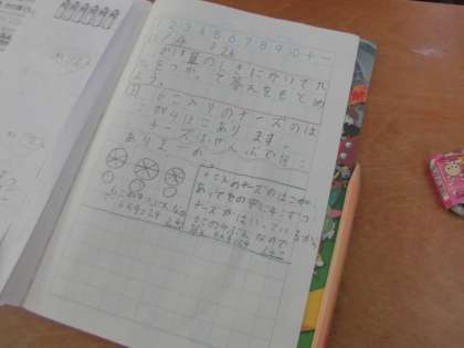 ノートに図と文で考え方を書き,となりの人と自分の考え方を交流し合いました。