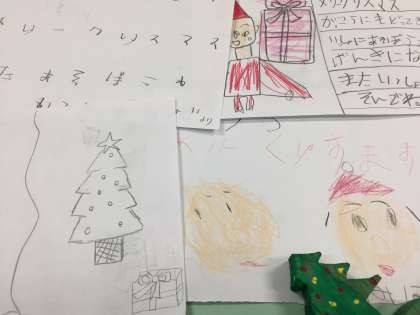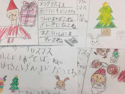 ステキなメッセージを書いたり,クリスマスにちなんだ絵を描いたりしました。