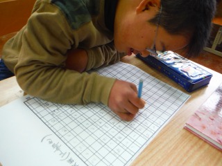 卒業アルバムにのせる小学校の思い出の作文を書き始めました。去年の6年生の作文を読んで,自分はどんなことが書きたいか話し合ってきました。「ぼくは楽しかったことを書きたい。」「ぼくは,がんばったことをたくさん書きたい。」と,それぞれのテーマでたくさん話して書くことを決めました。今日からいよいよ書きはじめです。やる気いっぱい,最高にていねいな文字の2人です。