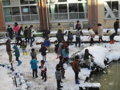 中庭に昨日から積もった雪で,子どもたちは雪遊びを楽しみました。