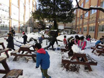 日曜日から降り積もった雪に大喜びの子どもたち。休みの日に遊んだ上に月曜日も雪が舞う中の登校で朝からハイテンションでした。早速1時間目に生活科「冬も元気に」の学習で中庭に出て冬を体感しました。雪に手を伸ばして雪だるま作りや雪合戦が始まりました。とても楽しそうにしていました。一方で,寒さが苦手なのか,首をすくめて固まったロボットのようになっている子もいました。また,池に氷が張っている様子を見て「鯉は,大丈夫なのかな。どこにいるのかな。」と心配している子もいました。