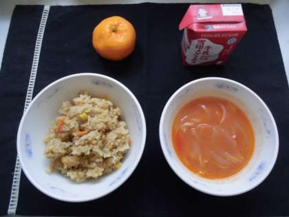 献立は,カレーピラフ.トマトスープ,みかん,牛乳でした。