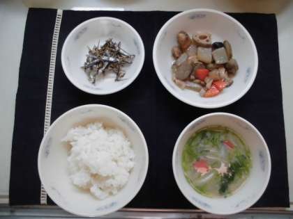 今日の献立は,ごはん,京風みそ汁,にしめ,ごまめ です。