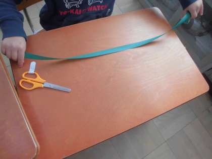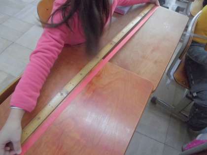 「1m選手権をします!」ということで,ものさしを使わずにテープを1mと思うところで切ります。切ったテープを友だちと見比べて「長すぎるなぁ。」「これくらいかなぁ。」と意見を交流しました。そして次にものさしを使って,切ったテープの長さをはかりました。「うわぁ,全然足りひんかった〜。」「あと2cmやった!」などと,すすんで学習に取り組んでいました。