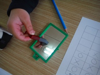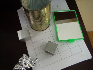 「磁石につくもの,つかないものを調べよう」 今日調べたのはみんな銀色のものです。アルミはく,クリップ,鏡,空き缶・・・・・予想通りだったり予想と違ったり。重さの勉強で使ったアルミと鉄の立方体はとても似ているけれど,磁石についたのは鉄の方だけなのか・・・・全部調べた人はランドセルの金具の中からつくものとつかないものを予想して調べました。「磁石につくものは鉄でできている。」のまとめのあとには,「鉄でできているものさがし」をしました。机の道具入れ部分は鉄でできている机と鉄でない机がありました。みんなの机はどちらかな?