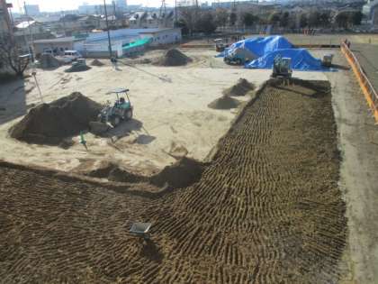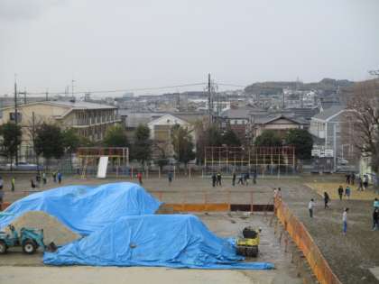 運動場の北側の削り取りが始まり,子どもたちは南側で遊んでいます。遊具も使えるようになりました。