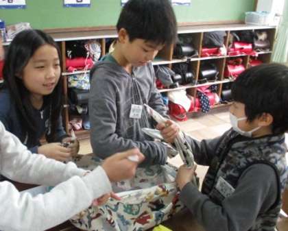 「ふろしきはどんなものも包めて便利だな。」「一人でいろんなものを包めるようになりたい。」「これから出かける時に物を包んで持って行きたい。」という感想が多く,ふろしきの魅力を感じることができたようでした。