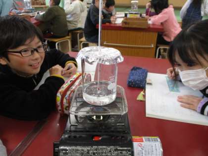 理科で「すがたをかえる水」という学習をしています。先日は, 水をあたため続けるとどうなるのかについて実験し,水をあたため続けた時の温度や体積,見た目の変化について調べました。水を熱して1分ごとに観察・記録をしました。ビーカーがくもったり,ブクブクしてきたり,あわが盛んに出てきたりするなどの見た目の変化を見逃さずに実験できました。また,温度上昇にも着目すると,「あれ?97度からずっと変わらない!」「100度にはならなかったよ。」など大切なことにも気づきました。体積は,はじめより若干減っていました。これからも生活経験をもとに予想し,それを自分の目でしっかりと検証していく学習を積み重ねていきたいです。