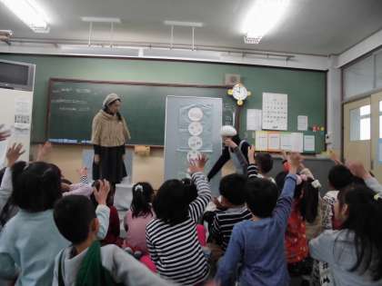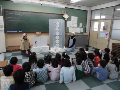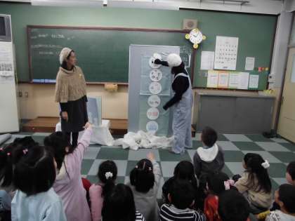 1年生に木いちごの会の方が,自分たちで作られた絵本を読み聞かせしてくださいました。女の子のららちゃんと雪だるまが出てきて,季節に合ったお話でした。読み聞かせの後に,雪だるまの飾りに着目した間違いさがしがあり,みんなは意欲的に間違いを見つけていました。最後に自分で作れる雪だるまのシートをプレゼントしてもらって大喜びの子ども達でした。教室で配ると,多くの子が早速作り始めていました。