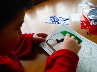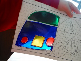 かしのみ学級でも,4年生は光を通す絵「サークルステンド」を作りはじめました。大好きな乗り物や標識を図案にして,カッターナイフでていねいに切り取ります。切り取ったところにカラフルなセロファン紙をはっていきます。