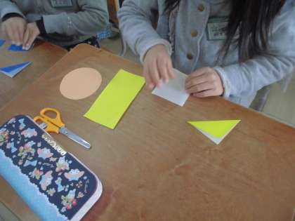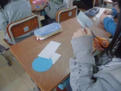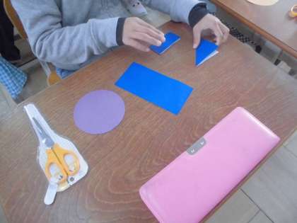 正方形・長方形・丸の形を紙を半分に切り,「半分に分ける…同じ大きさに二つに分けること」という学習をしました。