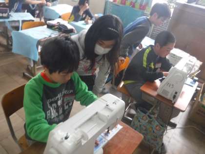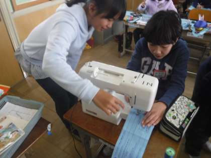 家庭科でミシンを使っています。からぬいをして使い方に慣れてから,ぞうきんを作ります。使い方をリレー形式で伝達していきました。人に教えると,頭に入ってきますね。