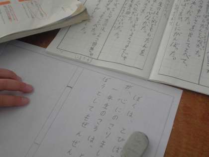 この一年間をふりかえって,心にのこったことを作文に書いています。メモをもとに,「はじめ」「中」「おわり」のまとまりに分けて書いたり,かぎ(「。」)の使い方や漢字の間違いがないか確かめたりして,取り組んでいます。