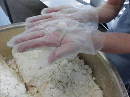 汁物に入っているふわふわのだんごは,豆腐と白玉粉を合わせ,練って,一つひとつ丸めて作られています。