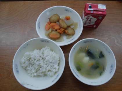今日の給食は,麦ごはん,ふわふわだんご汁,平天の煮付け,牛乳でした。