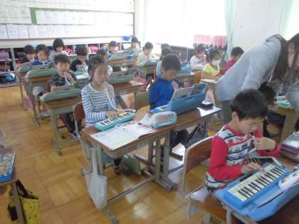音楽の学習で音階について勉強しました。声と手で音階について理解した後,鍵盤ハーモニカを使って曲を演奏しました。指づかいが難しい曲でしたが,一生懸命練習し,最後にはとても上手に演奏することができていました。