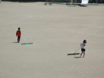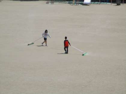 掃除時間,掃除当番の子どもたちが,広い運動場のブラシがけを頑張っています。