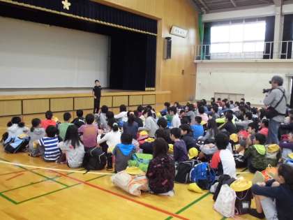 体育館で出発式を行いました。校長先生からは,2つのキーワード「平和」「友情」をいただきました。この2日間で,子どもたちは この2つのキーワードについて何を考え感じてくるでしょうか。