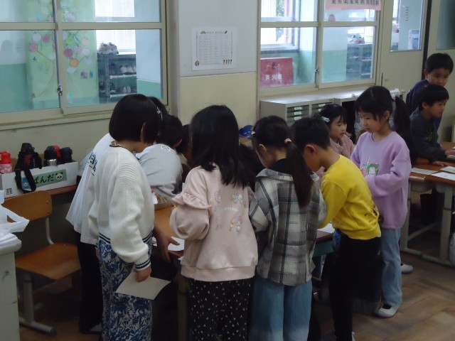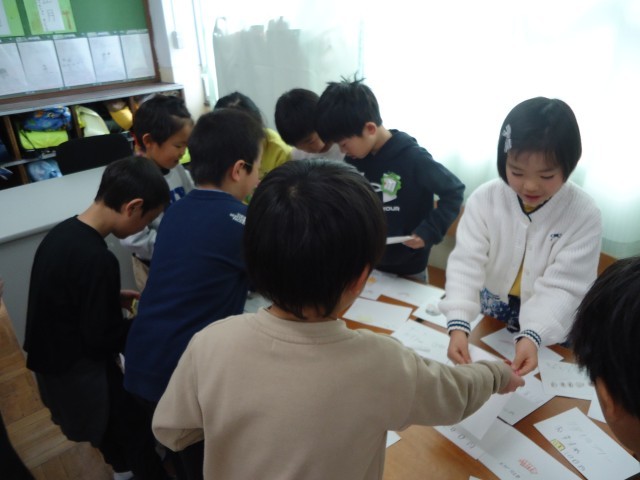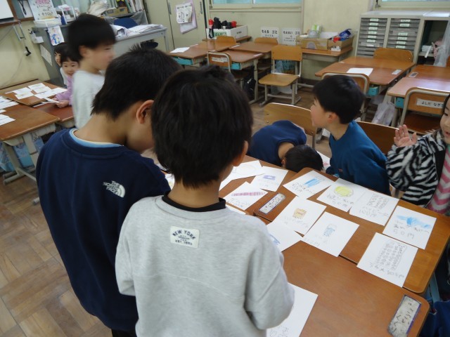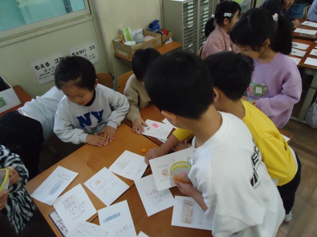 お店の人とお客さんに分かれて、実際に買い物に行ったときの会話を思いだしながら取り組みました。