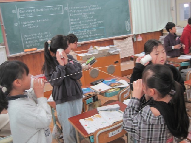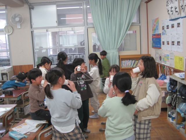 理科「音のせいしつ」の学習で、音はどのようにして伝わるのかを調べるために、糸電話を作り、実験を行いました。グループで協力して、たこあし糸電話にもチャレンジし、友達が話した声が何人にも伝わる様子を確かめながら「みんな聞こえた!」と、楽しんでいました。