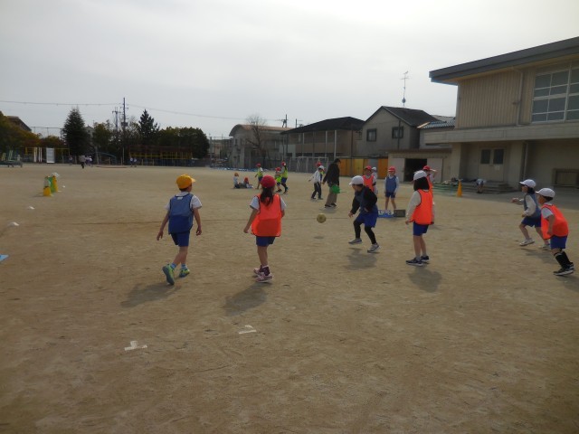 体育の時間は「ボールけりゲーム」をしています。3人でパスをつなげてシュート!!「〇〇さん、パス。」「こっち、こっち。」など、声をかけあって上手になってきました。