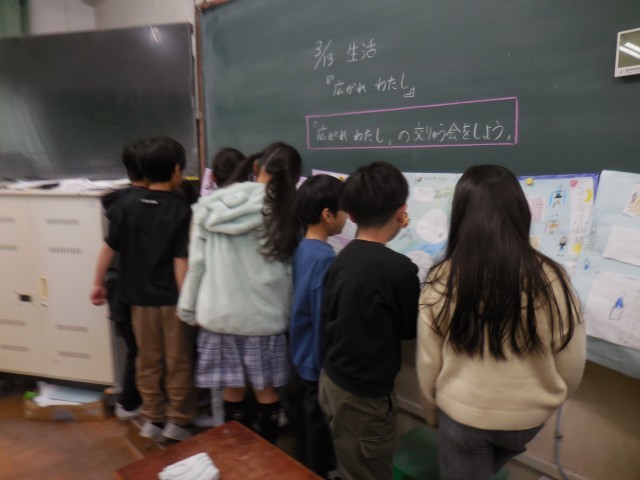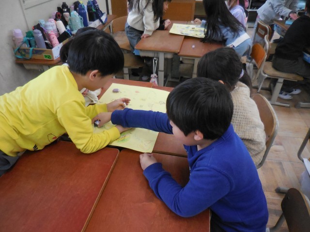 生活科「広がれ わたし」のまとめの交流をしました。「すごろく」「物語」「ランキング」「新聞」の中から一つ決めて、自分の成長をまとめたものを交流しました。「〇〇さんの作ったすごろく、おもしろい。」「〇〇さん、小さい時とかわってないね。」など、笑い声があちこちから聞こえる楽しい交流になりました。作った作品は、後日持ち帰りますので、見てあげてください。写真のコピーなどのご準備、ありがとうございました。