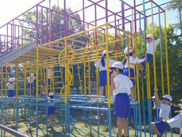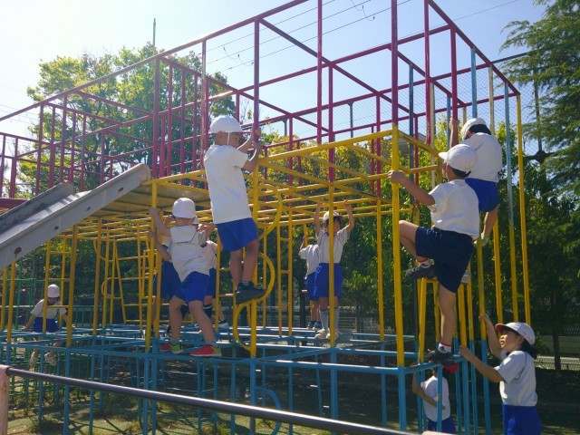 体育の学習で「ゆうぐあそび」をしました。1年生のころよりも高いところに挑戦し、のぼりおりやわたり歩きをしていました。