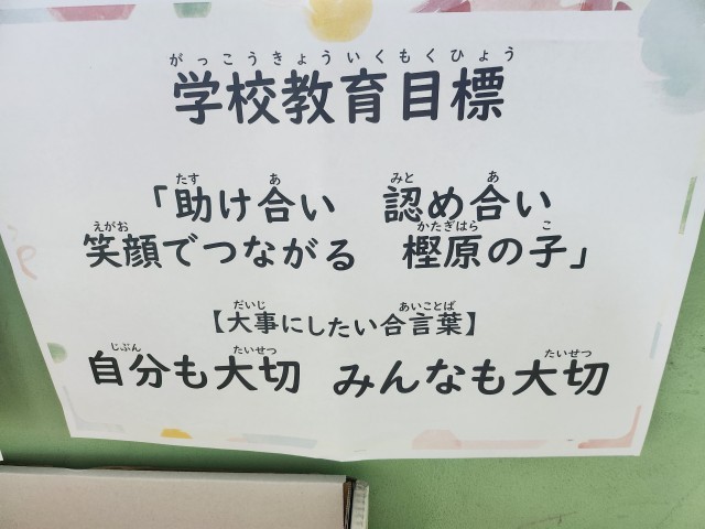 「助け合って 認め合って 笑顔でつながる 樫原の子」です。