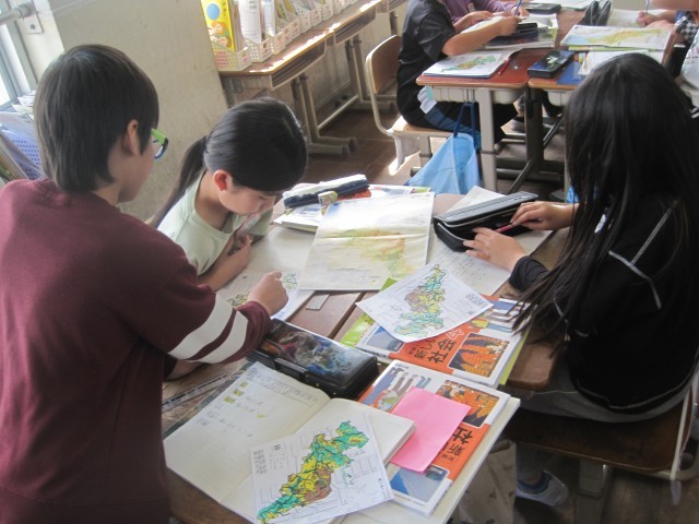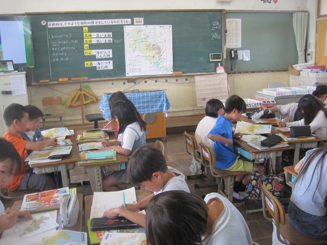 4年生になってはじめての授業参観。社会科で「京都府の地形の様子」を学習しました。地図を色分けしながら山や川、高地、盆地、湾、半島などに注目し、グループで協力して地形の名前を調べて記入しました。友達と相談しながら意欲的に取り組む姿が見られました。