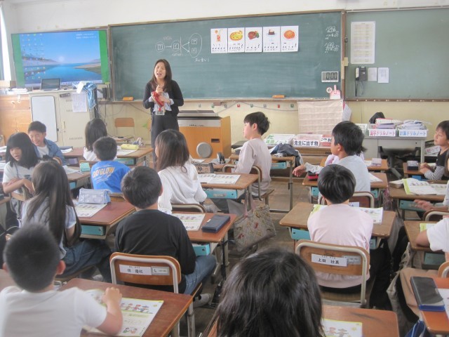 音楽の授業で、食べ物の名前をリズムに合わせて唱える学習を行いました。「ハンバーグ♪」「スパゲッティ♪」「オレンジジュース♪」など子どもたちが好きそうなメニューを拍に合わせて声に出すことで、楽しみながら音楽に親しむ様子が見られました。