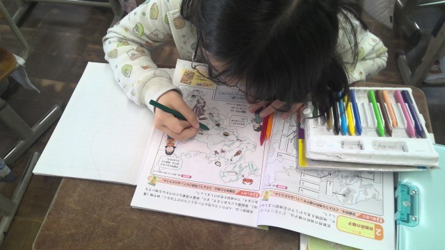 今日は京都府の土地の利用について考えました。前に学習した地形図から、どこで何が作られているか予想し、実際に資料に色を塗って確かめました。「田んぼや畑がいろいろな所にある!」「果樹園のそばに川がある!」「なんでやろう?」と友だちと気づいたことをたくさんつぶやいていました。その気づきをみんなで一つずつ確かめながら、まとめていきました。京都についてどんどん詳しくなる4年生です。