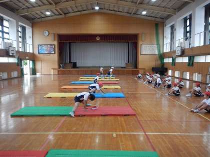 今日は前転や後転,開脚前転や開脚後転を1つずつチェックしていきました。上手に回れている子ども達を見本に,みんなで一生懸命がんばりました。