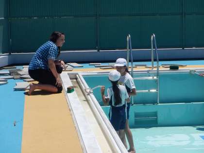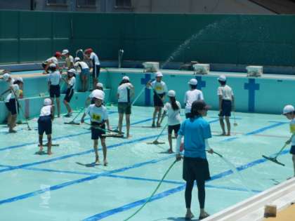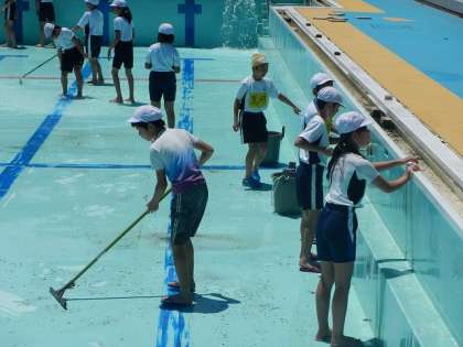 もうすぐ始まる水泳学習に向けて,プール清掃を6年生が行いました。